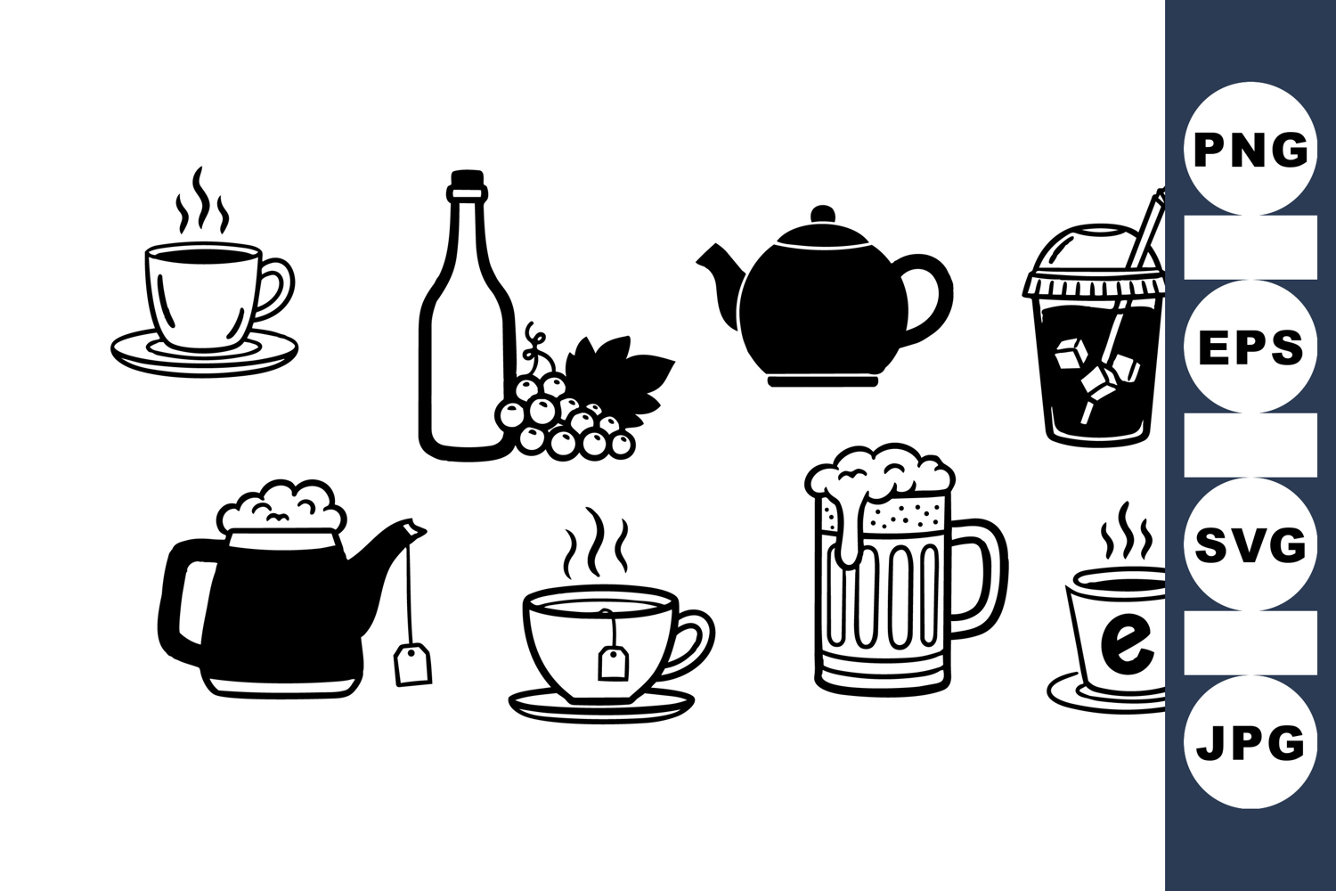Flat black and white icons featuring hot coffee cups, teapots, milk bottle, beer mug, and cold drink with a straw in minimalistic style for menus and apps.