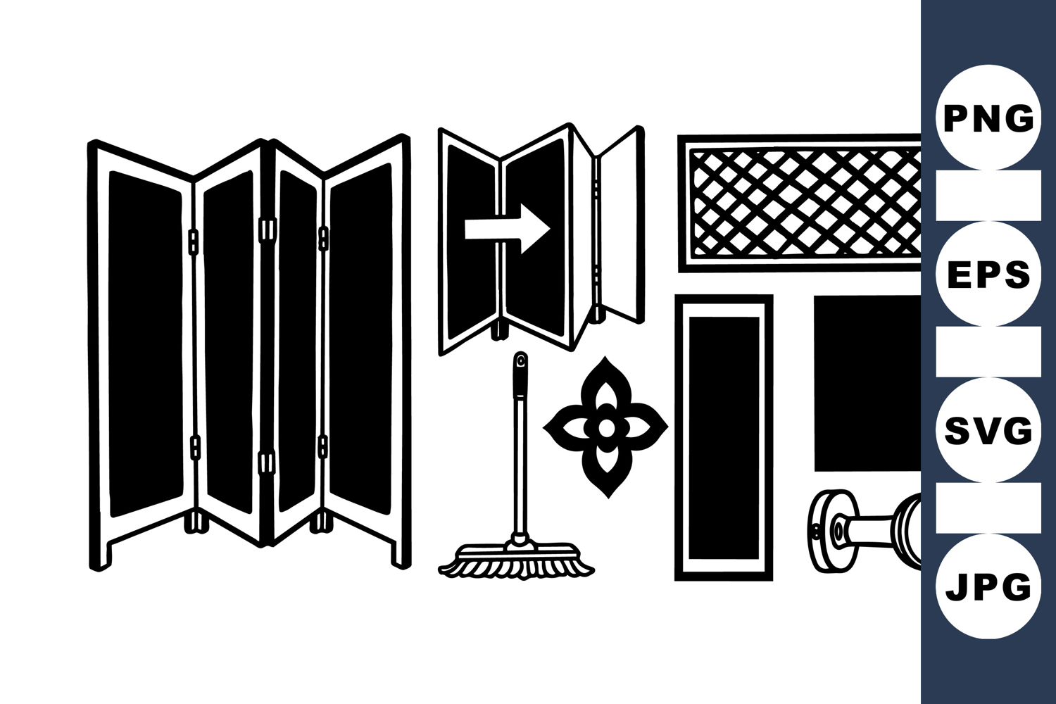 Vintage Interior Clipart Interior Design Graphics Decorative Door Art Japanese Room Decor Traditional Decor Set Folding Screen Clipart Wooden Panel Design Asian Home Decoration Room Divider Bundle Floor Mop Illustration