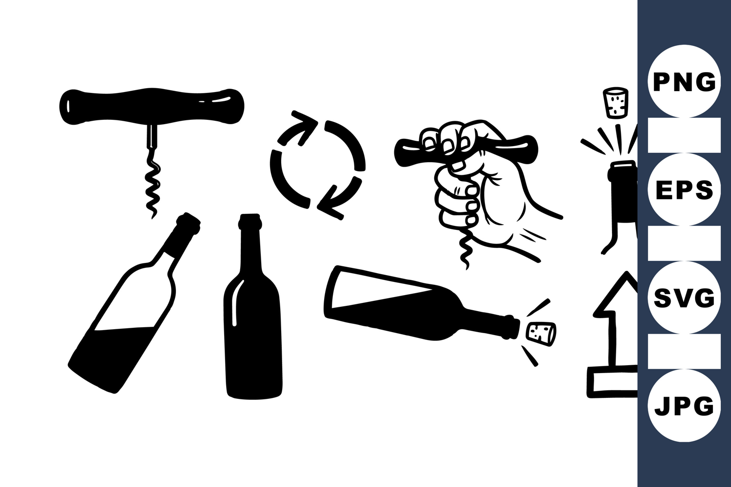 Silhouette illustration shows a hand using corkscrew to open sparkling wine bottle with cork popping out and recycling arrows, simple monochrome style, clear concept