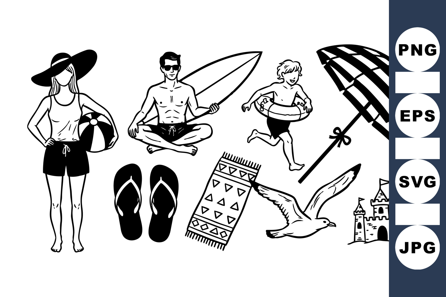Illustrated beach elements including a woman holding a beach ball, a meditating man with a surfboard, running child, umbrella, flip flops, and seagull in black and white line style