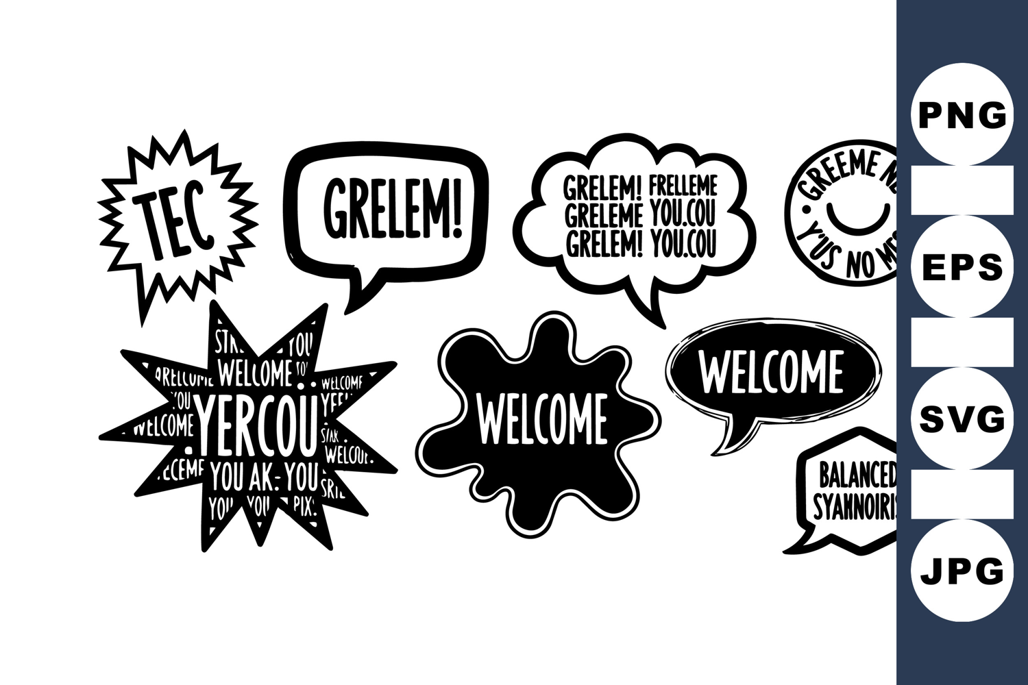 Black and white comic speech bubbles display multiple welcome phrases and comic sounds with bold outlines in a graphic design style, dynamic and expressive.