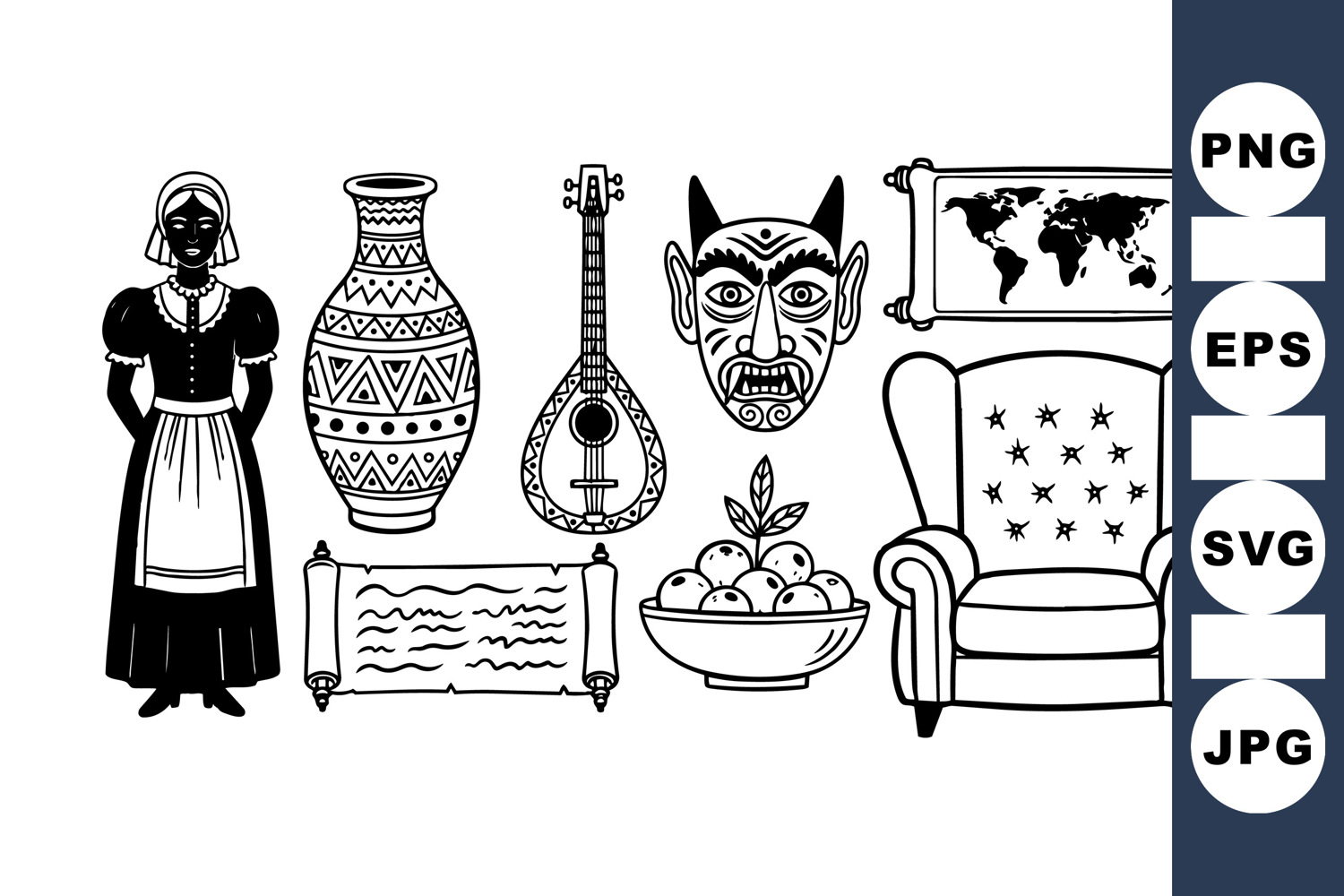 A collection of black and white line art featuring vintage cultural icons such as a vase, mandolin, mask, an armchair, a woman in traditional dress, and a bowl of fruits, presented in a clean, minimal style.