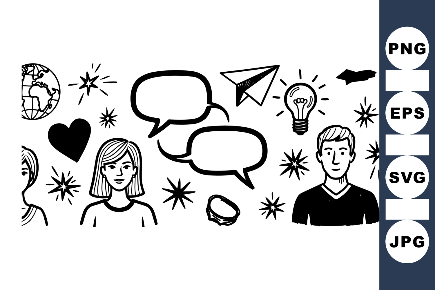 Illustrated black and white sketched people with speech bubbles, light bulb ideas, paper plane, and communication symbols convey dialogue and interaction in a simple style.