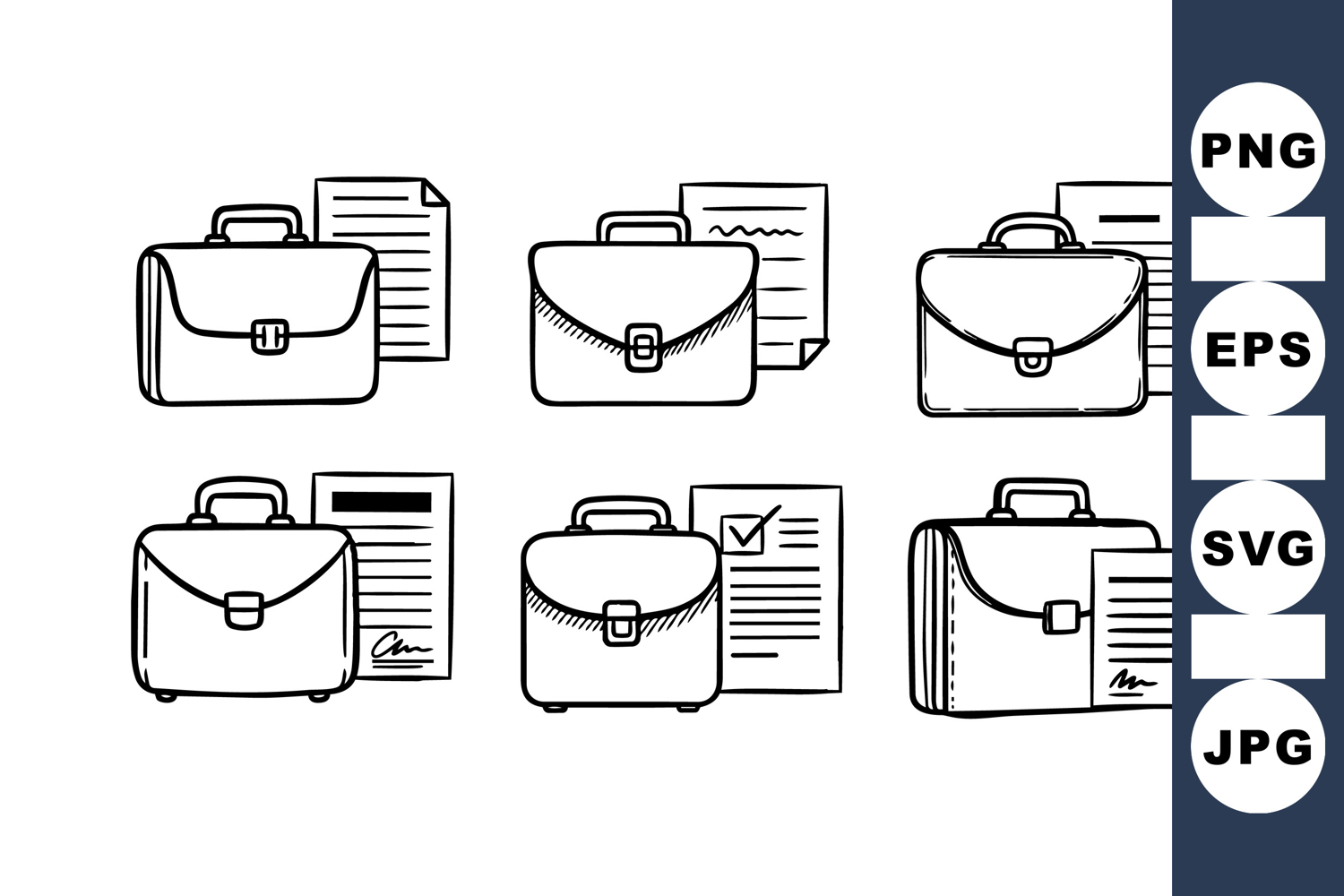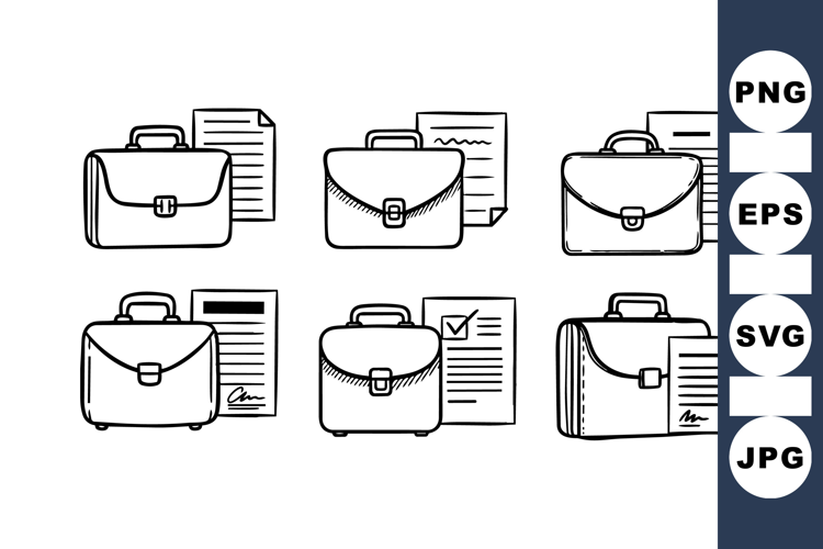 Set of six hand sketch style black line briefcase icons with different document designs, showcasing minimalistic office work themes in monochrome style, clean and simple.