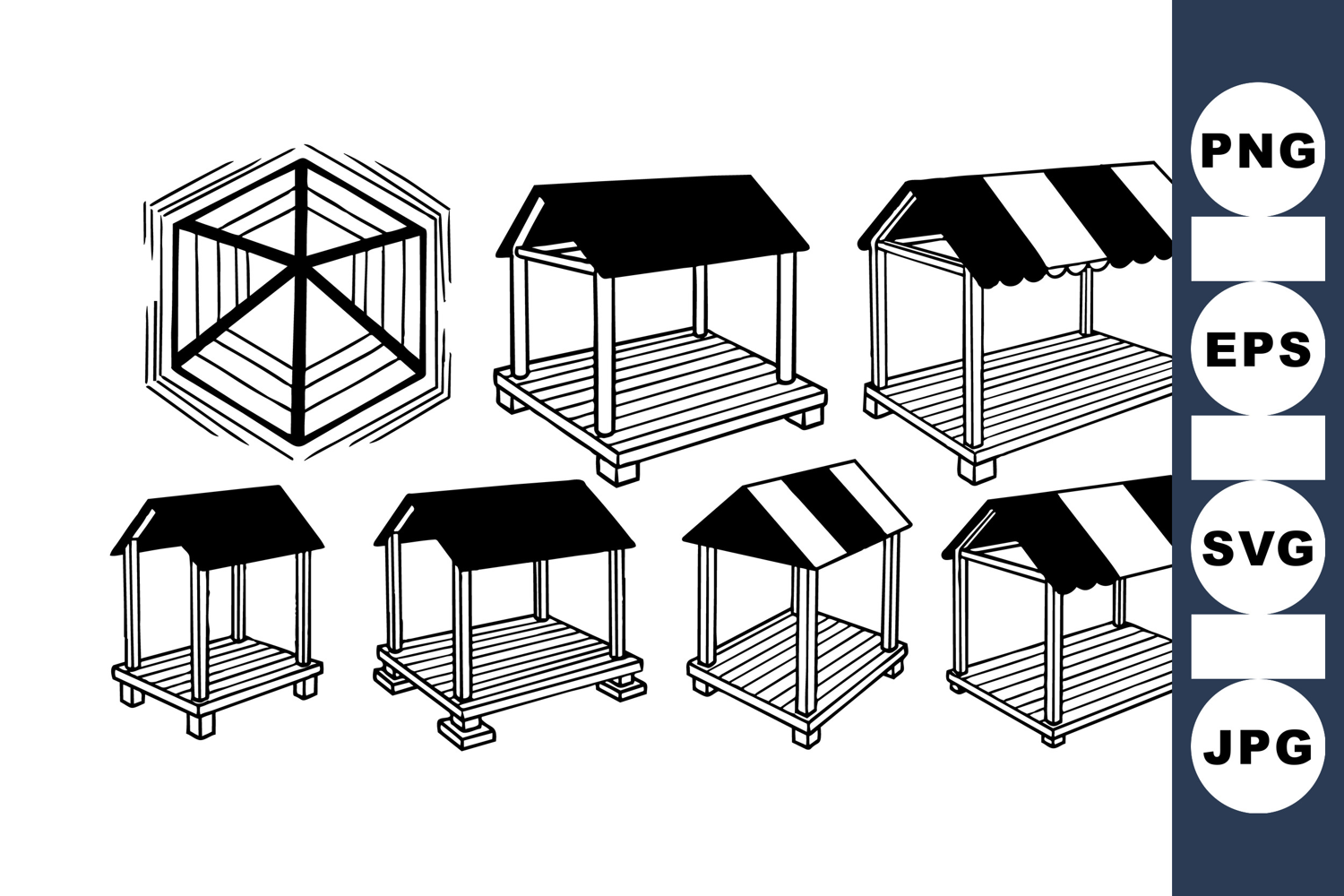 Detailed black and white line drawings showcase eight different market stall designs with varying roofs and side panels in front view.