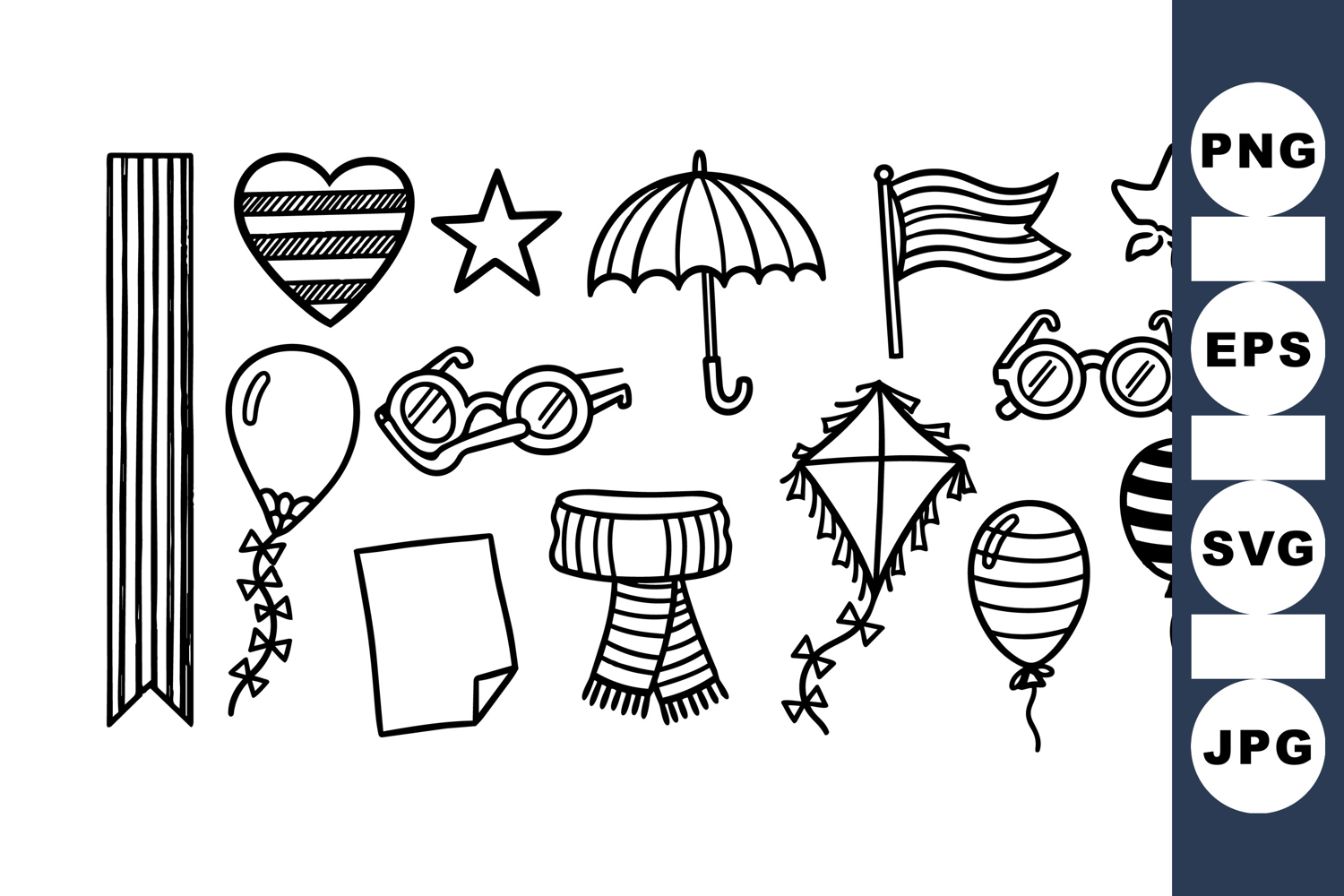 A variety of black and white line drawings showcasing an umbrella, balloon, kite, flag, heart, and glasses with american patriotism theme, simple and clear style for graphic use.