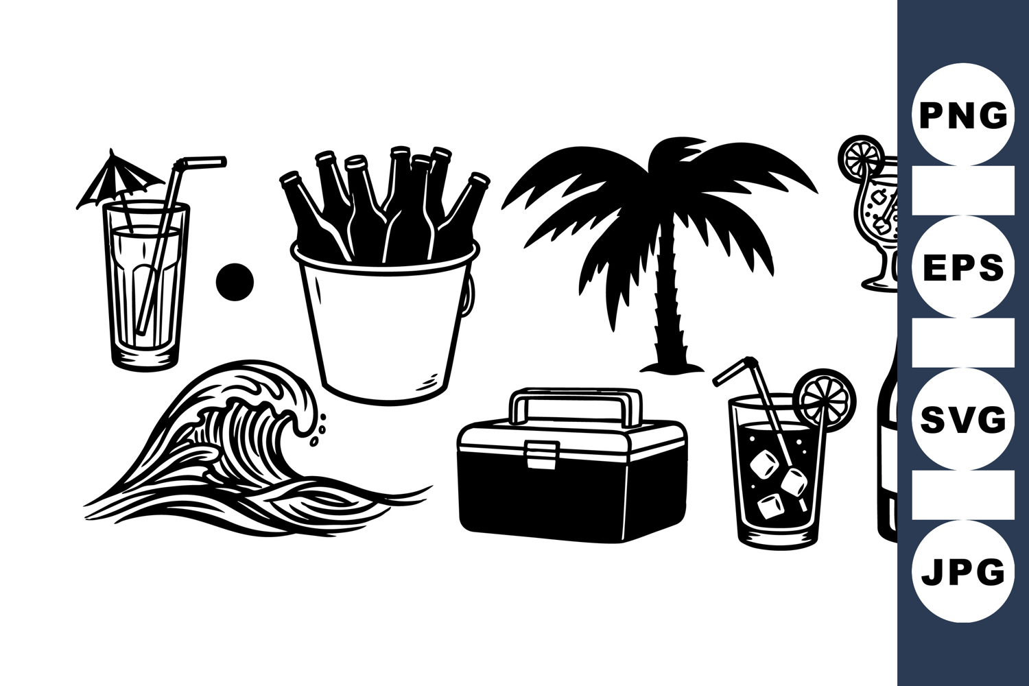 Monochrome line art collection of tropical beach themed icons with palm tree, waves, fries, drinks, and a cooler in a simple flat style suitable for logos and branding.