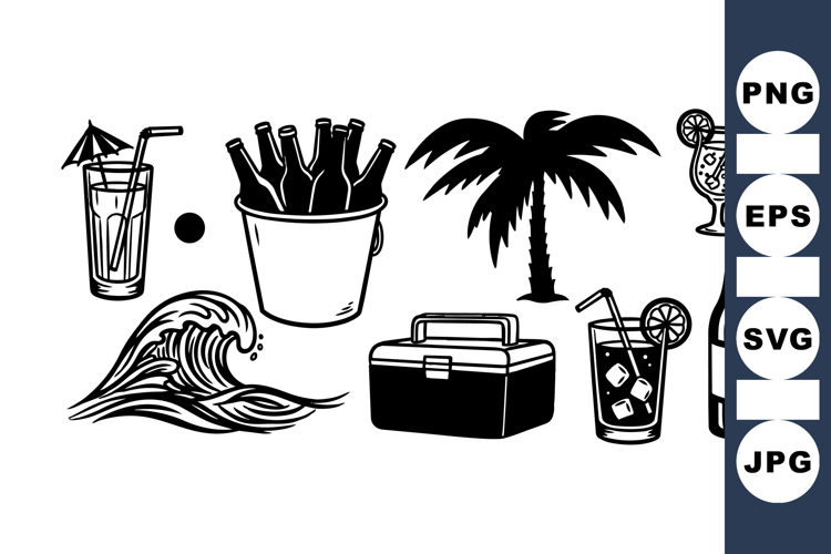 Hand Drawn Summer Beach Vacation Clipart Palm Tree Illustration Vintage Beach Clipart Tropical Cocktail Design Summer Holiday Set Ocean Wave Graphics Summer Party Bundle Retro Drink Clipart Cooler Box Clipart