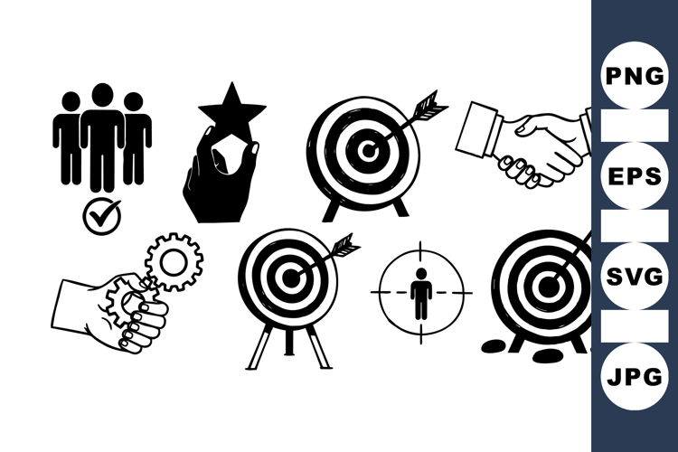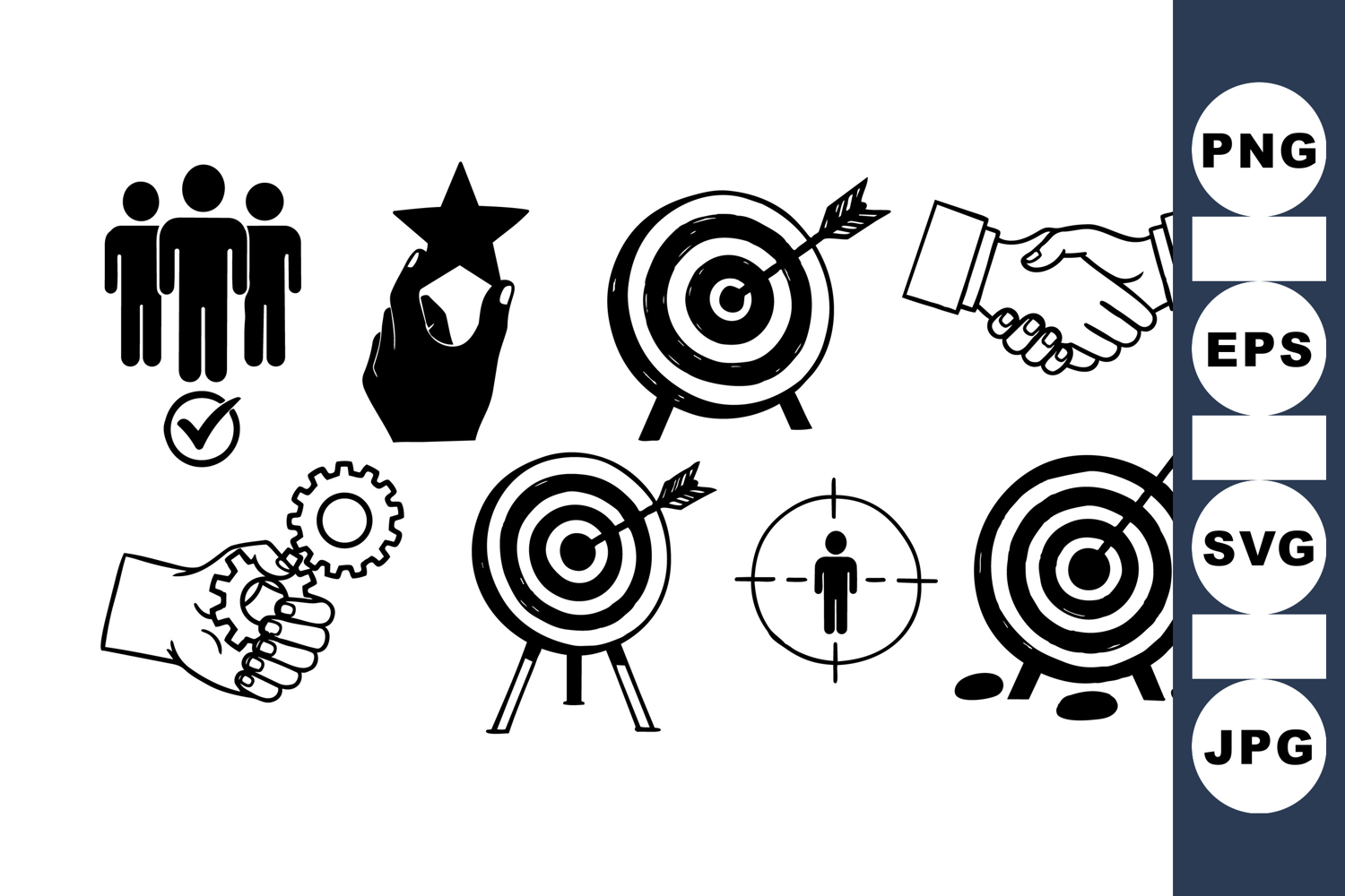 Simple black and white business icons including handshake, target boards with arrows, teamwork, star award, and gear mechanics representing success and goal achievement.