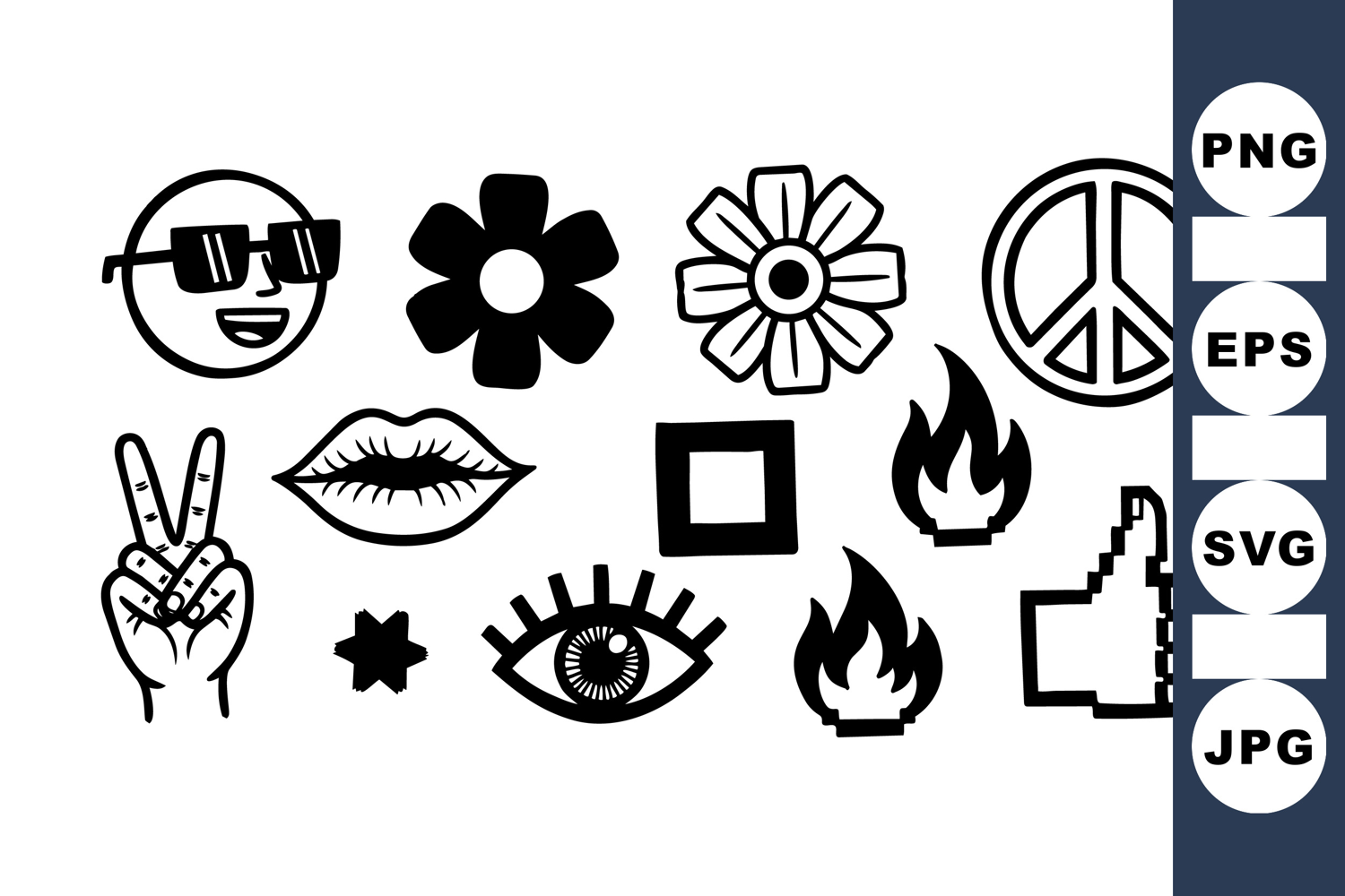 Vintage Flower Clipart Thumbs Up Vector Hand Gesture Icons Black Vector Clipart Modern Lineart Set Retro Icon Bundle Peace Symbol Set Pixel Fire Graphics Cool Sunglasses Design Hippie Style Icons