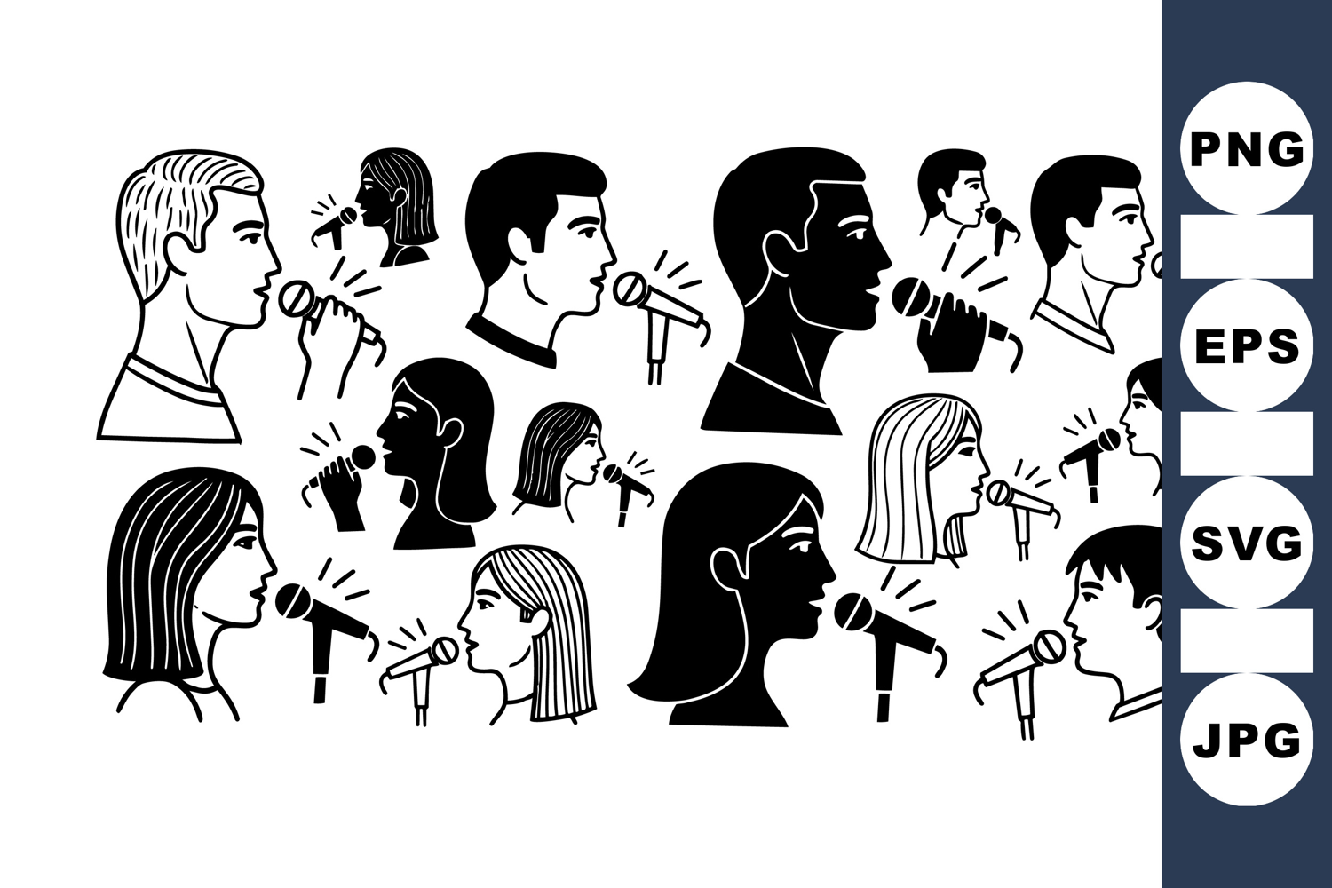 Various black and white silhouettes of men and women singing into microphones in profile view, suitable for entertainment or music themes, minimalist style.