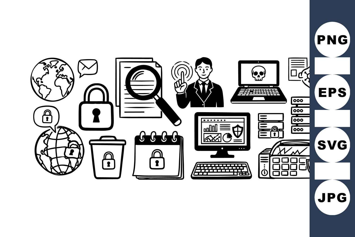 Monochrome vector cybersecurity icons display locked globe, magnifying document, hacker laptop, secure server, and shielded computer with keyboard in minimalist style, conveying digital safety and risk awareness.