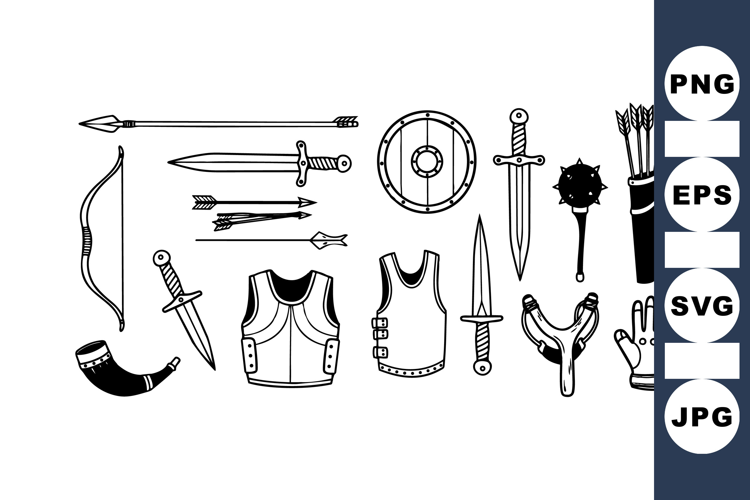 Bow And Arrow Design Medieval Weapon Clipart Armor Svg Bundle Vintage Sword Set Knight Battle Gear Historical Weapon Collection Medieval Combat Graphics Shield And Dagger Pack Vector Knight Armor Historical Battle Kit