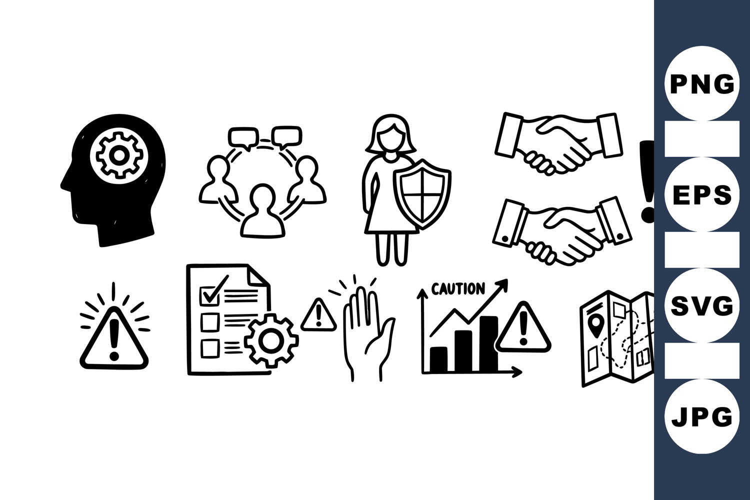 Management Icon Set Warning Sign Vector Growth Chart Graphics Strategy Planning Icons Business Risk Icons Security Protection Icons Handshake Agreement Icon Risk Assessment Symbols Team Communication Icons Business Process Map