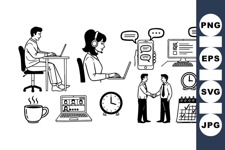 Simple black and white vector art depicts office workers typing on laptops, video conferences, handshakes, clock, calendar, coffee cup, and chat bubbles in minimal style.