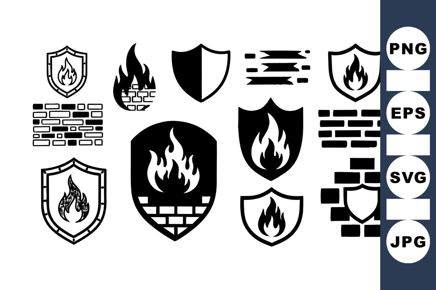 A set of black and white vector fire shield icons combined with brick wall patterns in minimalist flat style, ideal for safety and security concepts.