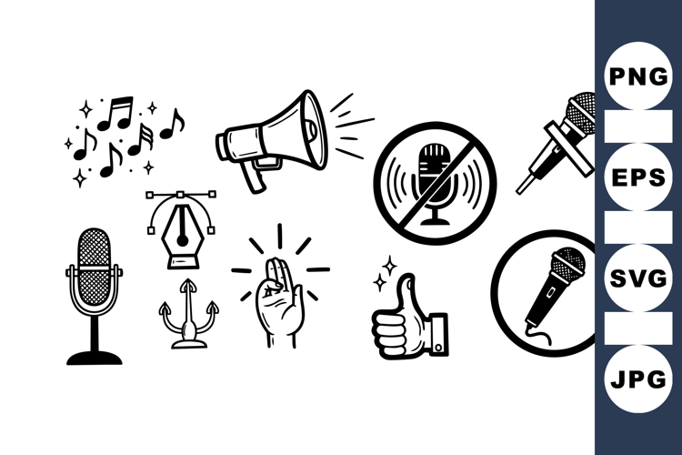 A minimalist set of black and white flat design icons including microphones, sound symbols, hand gestures, and music notes for audio or communication projects.