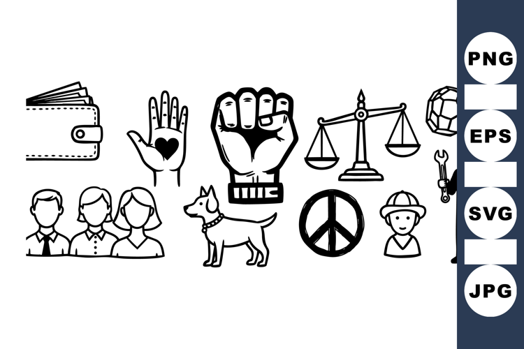 Collection of black and white vector icons including a wallet, raised heart palm, clenched fist, justice scale, dog, peace sign, child, and worker holding wrench in minimalist style.