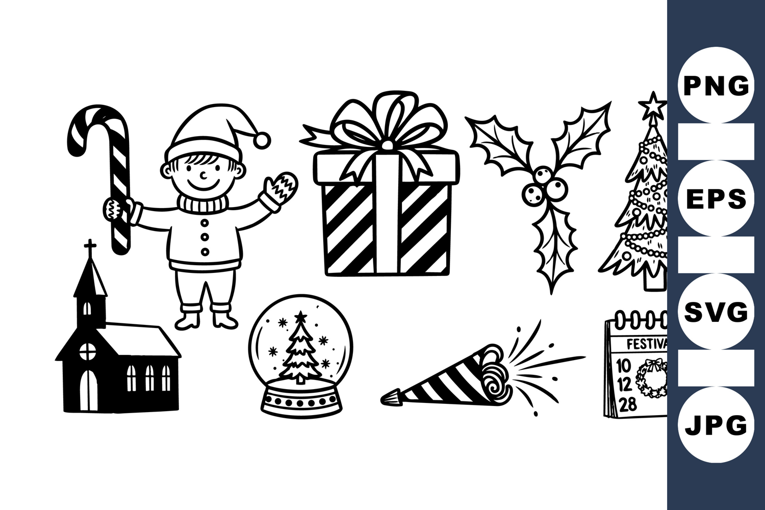 Hand drawn christmas doodle vector including joyful elf with candy cane, holiday gift, decorated tree, holly leaves, church, snow globe, party popper, and calendar icons in black and white style, festive and charming.