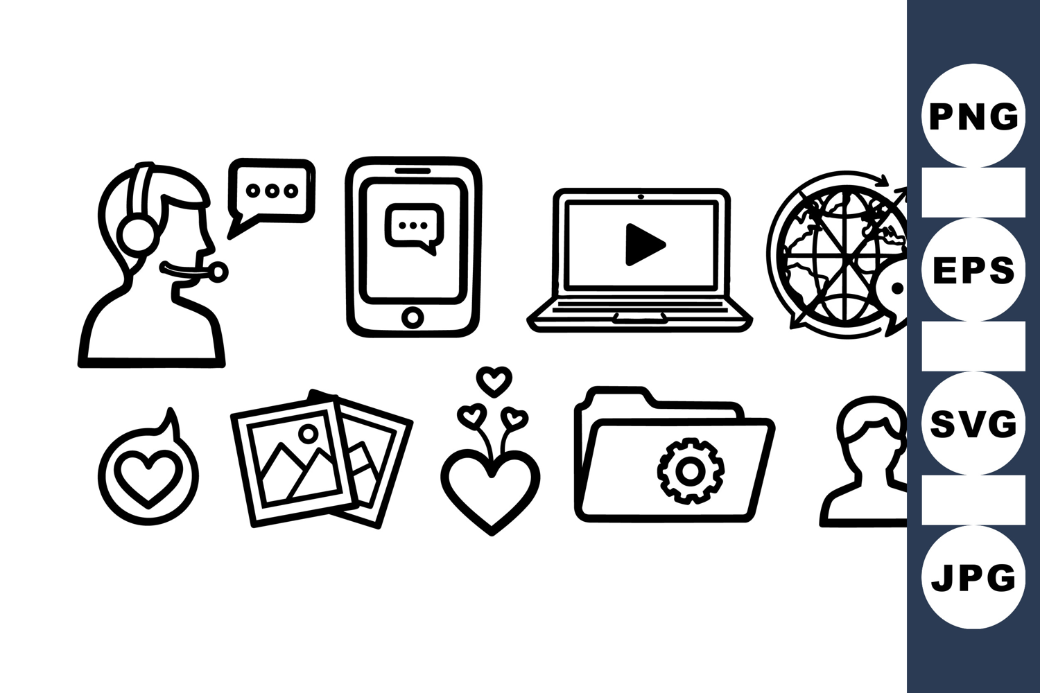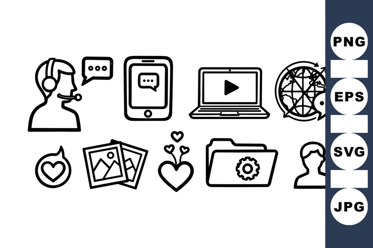 Set of minimalist line art icons including customer service headset, chat bubbles, smartphone, laptop with video, globe with speech, folder settings, and hearts expressing communication and support concepts, clean and simple style for digital or print use.
