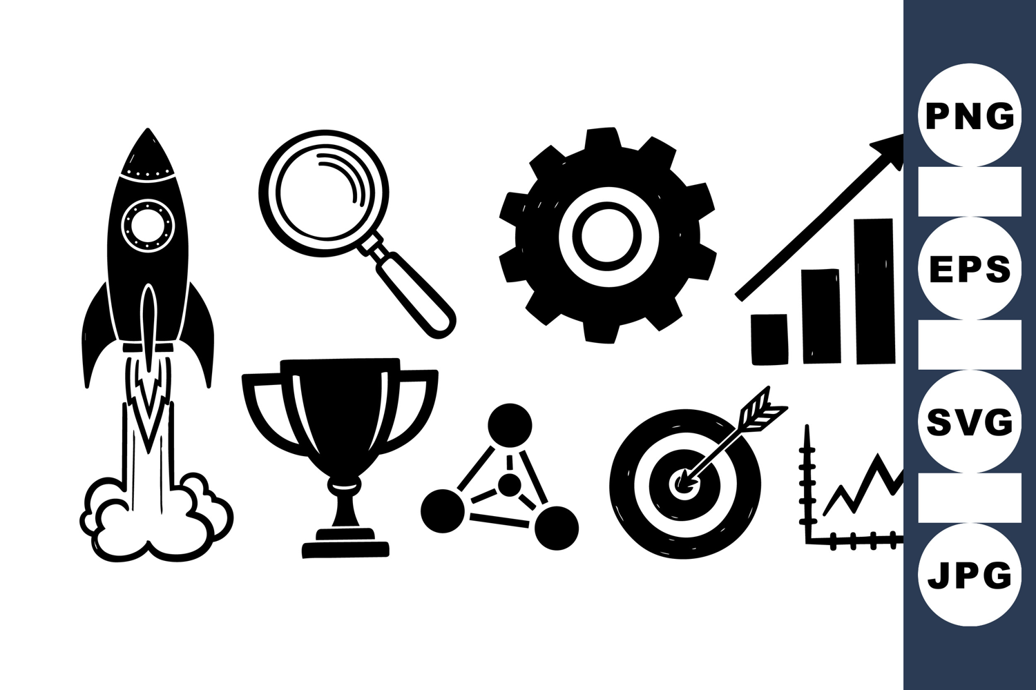 Black and white hand drawn style business icons including rocket launch, magnifier, trophy, gear, network, target, and growth chart representing success and progress.