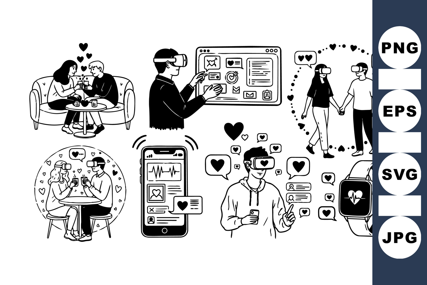 Couples wearing vr headsets interact with virtual hearts and smart devices in diverse romantic scenarios, illustrated in minimalist black and white line art style with a tech vibe.