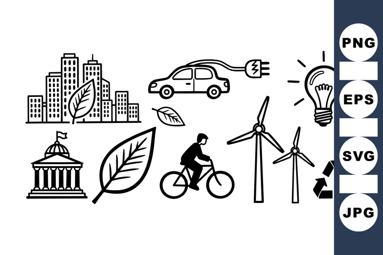 Black and white line art icons representing eco friendly city life including green energy sources, electric vehicle, cycling transport and recycling concepts, simple and clear style.