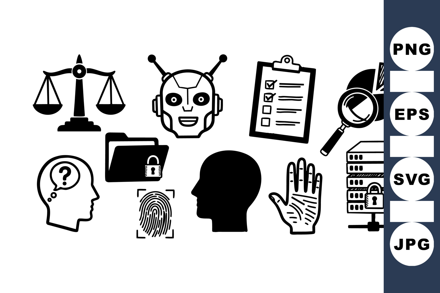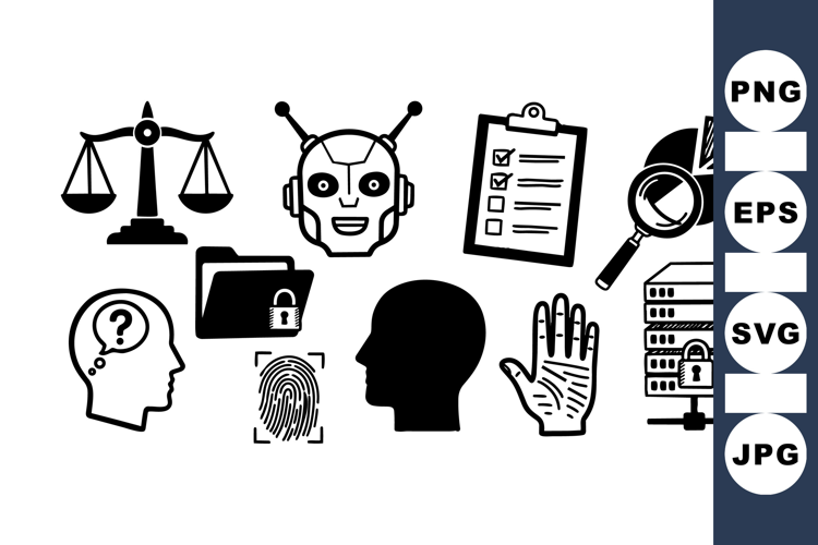 Robot Head Vector Cybersecurity Icon Set Data Protection Vector Digital Privacy Icons Technology Security Graphics Network Analysis Bundle Biometric Access Symbols File Encryption Illustrations Security Checklist Clipart Information Security Pack