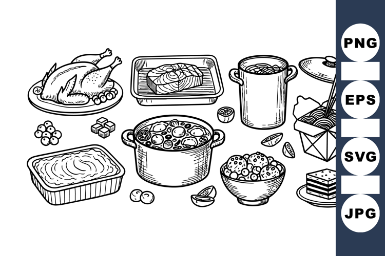 A detailed black and white vector illustration displays various foods including roast chicken, baked salmon, soup pot, asian takeout noodles, mashed potatoes, and dessert slice in intricate line art.