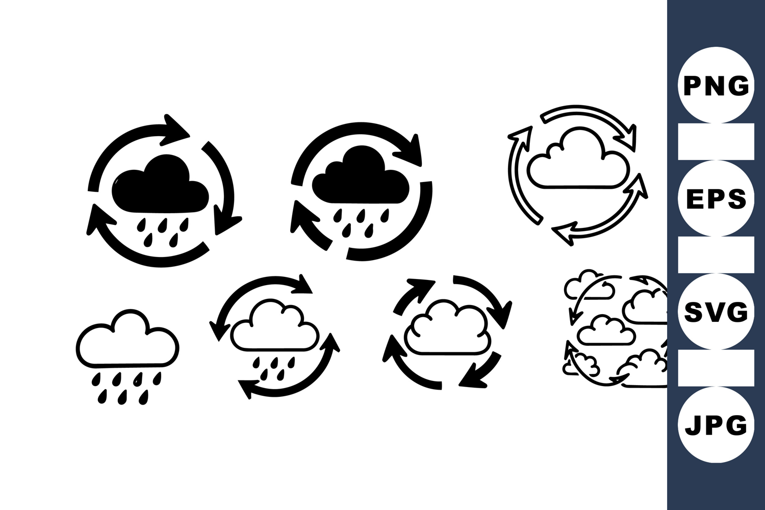 Minimalist cloud and rain vector icons featuring circular arrows illustrating weather cycles and precipitation, suitable for web and app interfaces, clean and clear style.