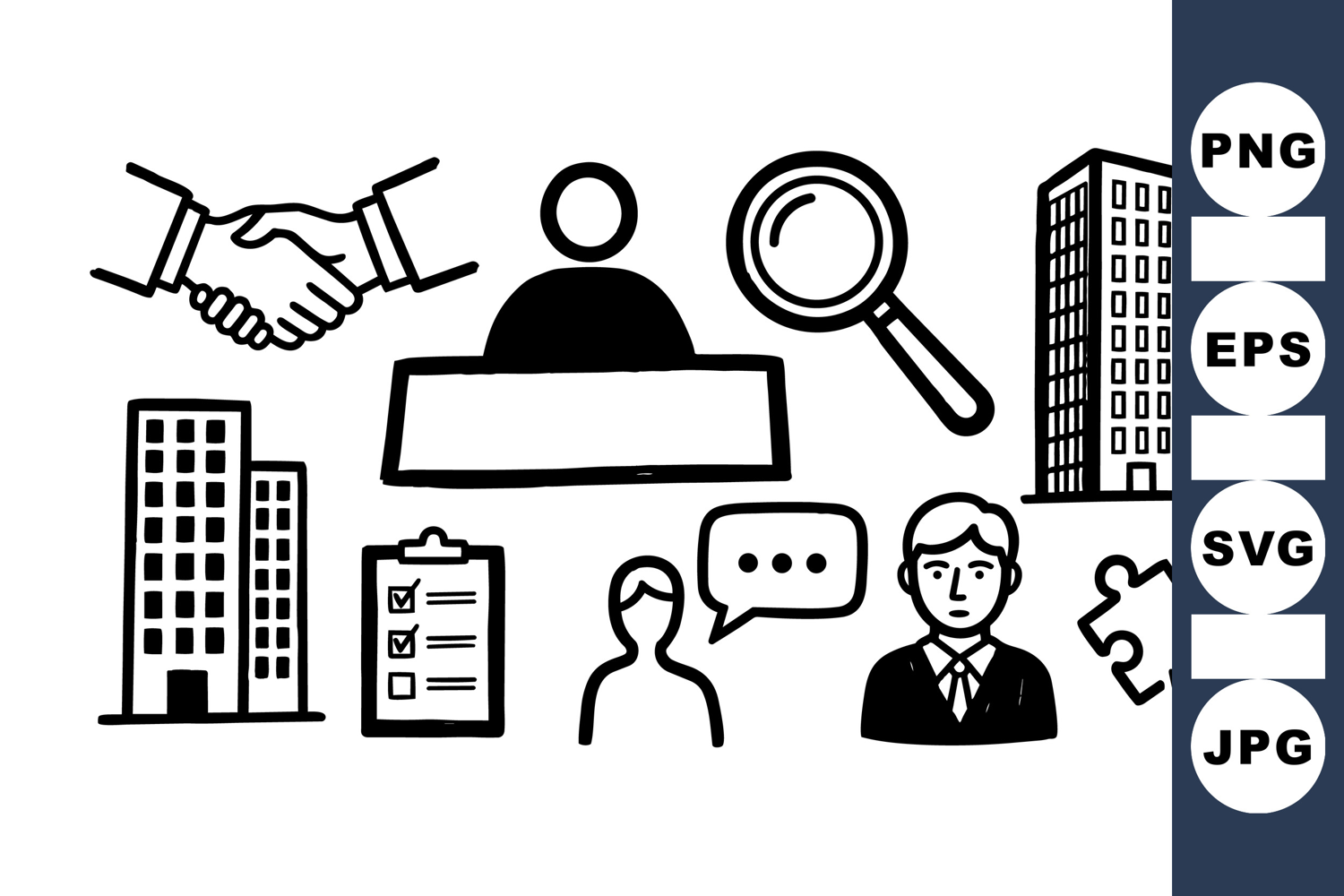 A set of black and white vector icons showing handshake, magnifying glass, business people, communication bubbles, checklist, puzzle piece, and office buildings in minimal style.