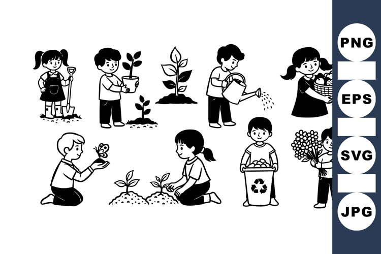 Children engaged in various gardening activities including planting, watering, harvesting fruits, recycling, and holding flowers in a clean black and white vector art style.