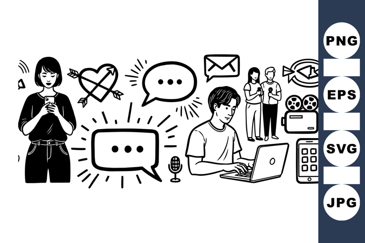 A detailed black and white line art depicts a man typing on a laptop and a woman texting on smartphone surrounded by social media and communication icons, conveying digital interaction and connectivity in a minimalist style.