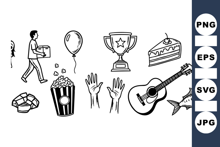A collection of black and white hand drawn vector icons featuring a walking man with box, balloon, trophy, cake slice, popcorn, raised hands, guitar, and fish in simple style