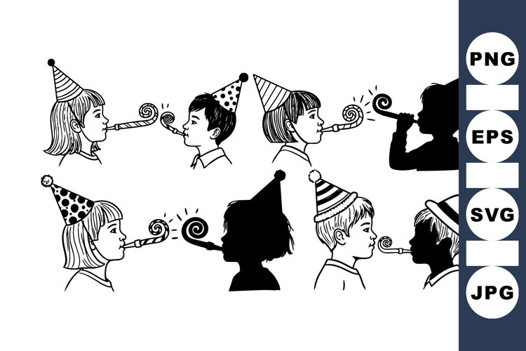 Illustrated children in profile wearing striped and polka dot party hats blow curled party horns in a playful black and white vector style, festive and lively mood.