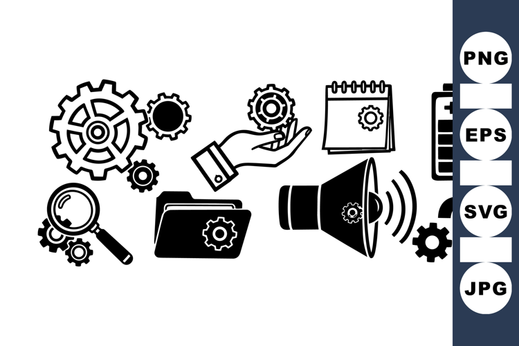 A monochrome vector collection showing business and technology icons with gears, magnifier, folder, calendar, battery, speaker, and question mark symbols in flat design style.