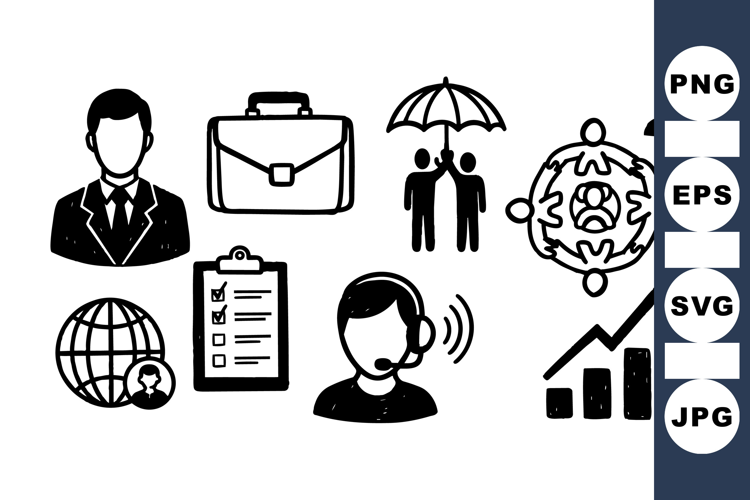 Black and white hand drawn vector icons illustrate business concepts such as professional man, support agent, collaborative teamwork, and upward progress in minimalistic style.