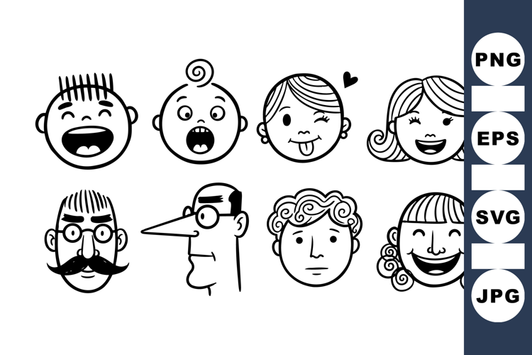Funny Face Clipart Hand Drawn Faces Black White Clipart Expression Vector Set Cartoon Face Bundle Emotional Face Graphics Kids Character Illustrations Smiling Face Designs Cute Avatar Bundle Comic Head Vectors