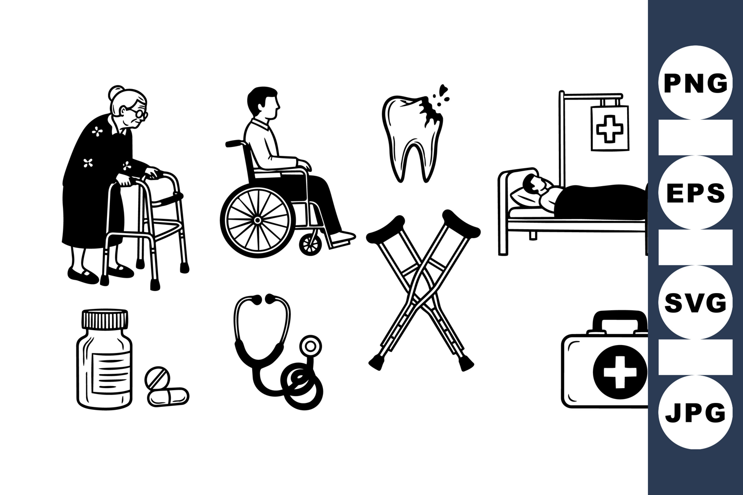 A black and white vector set of medical icons including elder care, mobility aids, dental damage, hospital bed, and medical equipment in minimalistic style, informative and clear.