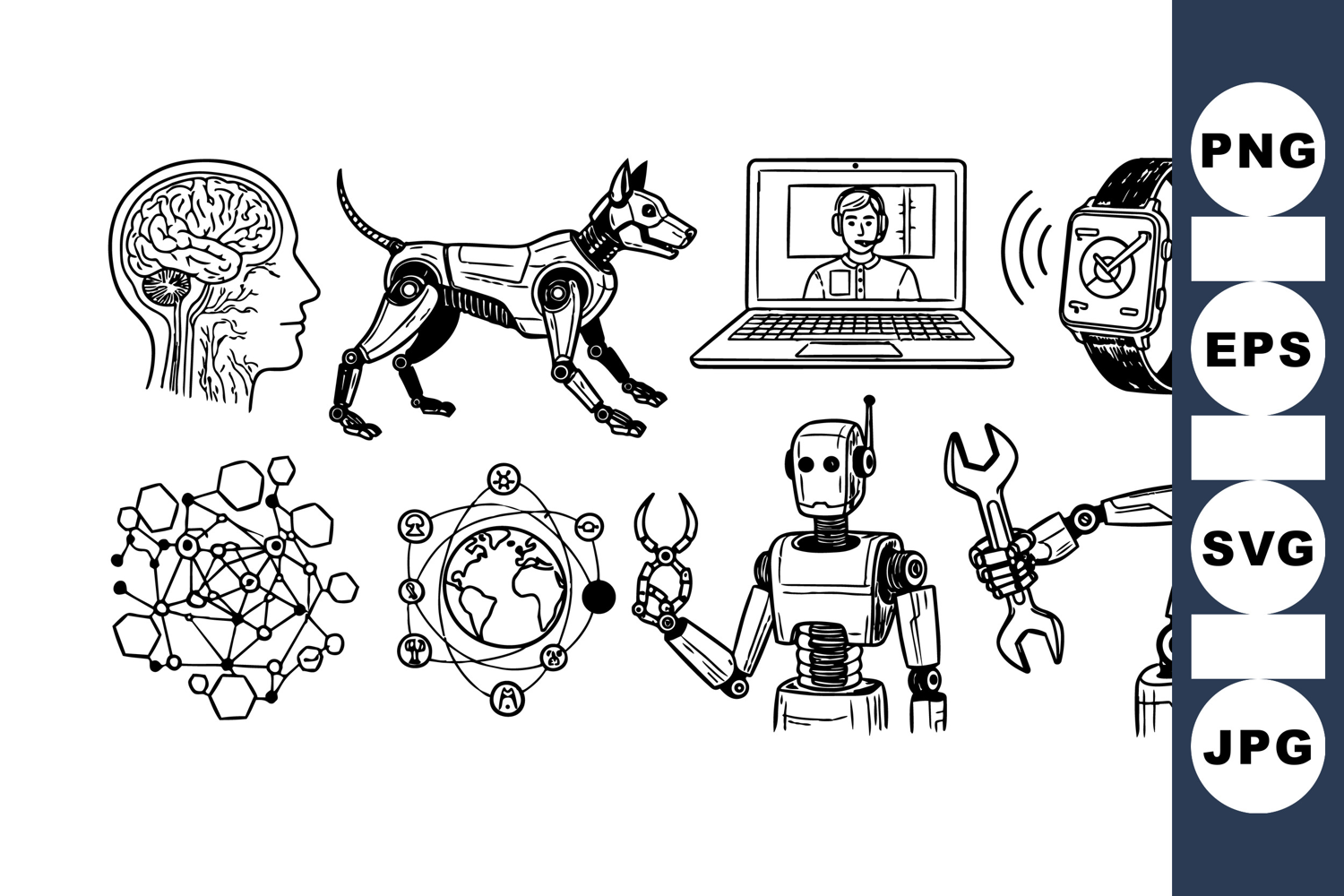 A black and white line art vector featuring a robot dog, humanoid robot with wrench arm, laptop video call, smartwatch airplane mode, brain, and network graphics in a technical style.