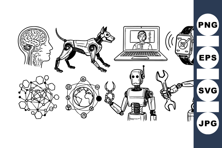 Artificial Intelligence Design Robotic Technology Clipart Hand Drawn Robot Set Futuristic Device Bundle Mechanical Arm Illustration Digital Innovation Graphics Technology Concept Artwork Automation System Clipart Wearable Tech Illustration Scientific Gadget Set