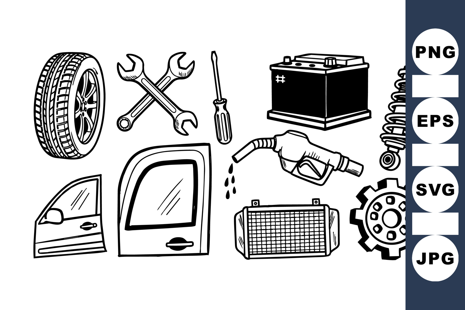 Black and white vector line drawing illustrating various car parts such as tires, tools, battery, fuel nozzle, shock absorber, radiator, and vehicle doors in clean minimalist style for automotive design use