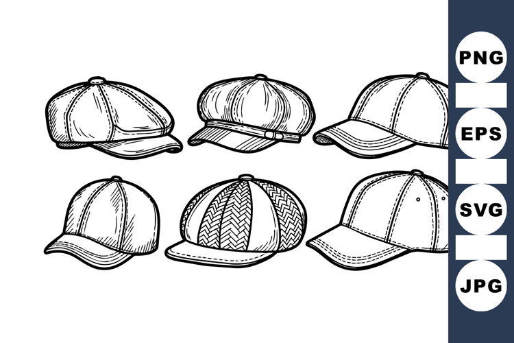 A detailed hand sketched collection of vintage hats including baseball caps and newsboy flat caps presented in a classic black and white sketch style.