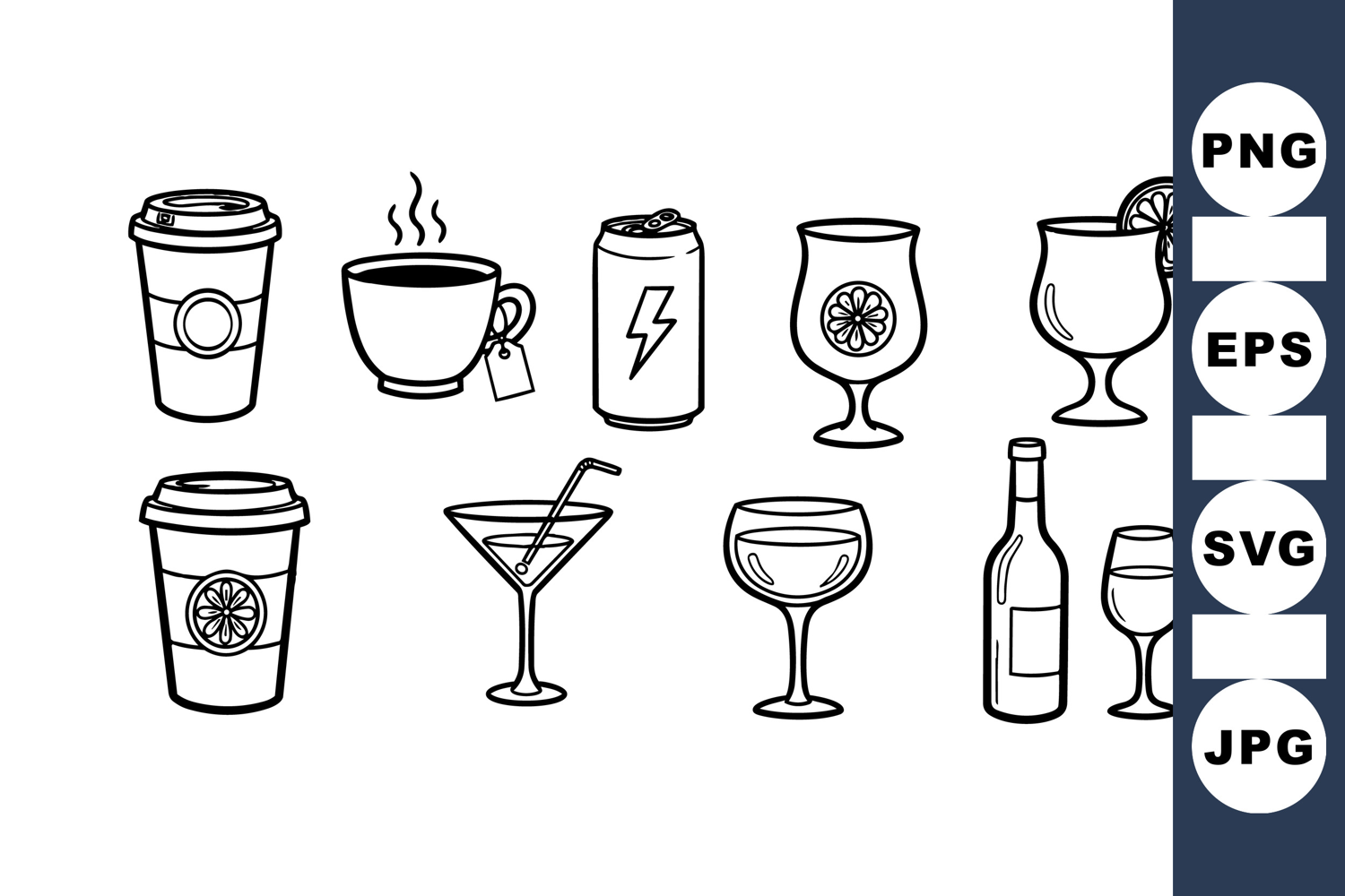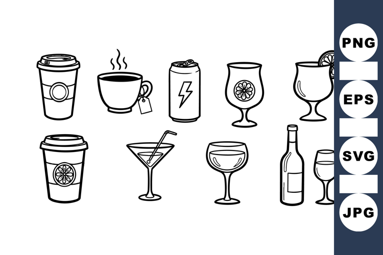 Black line art vector set showcasing various beverages including coffee cups, tea, energy drink can, cocktails, and wine glasses in minimalist style with clear outlines.