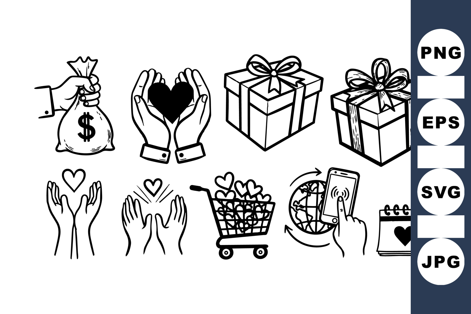 Black and white hand drawn style vector icons depicting hands holding hearts, gift boxes, a money bag, a shopping cart filled with hearts, and a calendar heart symbol with minimalist line art.