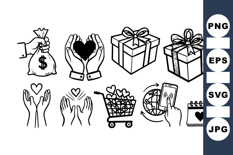 Hand Drawn Icons Gift Box Illustration Mobile Phone Icon Shopping Cart Design Charity Donation Graphics Heart Symbol Clipart Calendar Heart Drawing Online Commerce Set Giving Hands Clipart Love Gesture Design