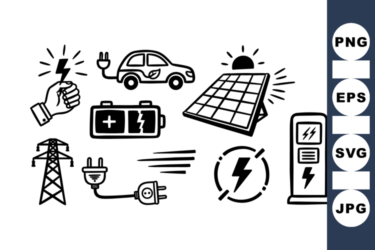 Collection of hand drawn icons illustrating electric car, solar panel, battery, power plug, transmission tower and charging station in simple black line art style.