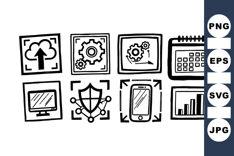 Hand Drawn Icons Mobile App Icons Technology Icon Set Digital Sketch Bundle Tech Ui Clipart Software Interface Graphics Cloud Data Illustration Security Technology Pack Business Analytics Design Workflow Digital Kit