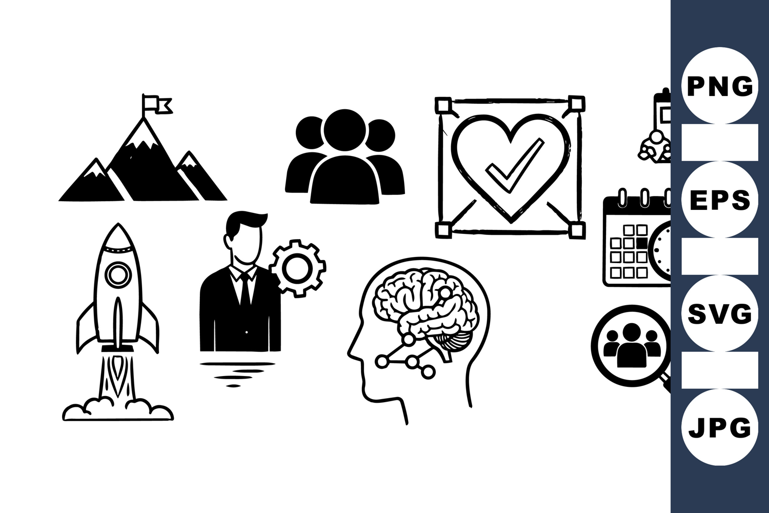 Business Strategy Icons Time Management Icons Business Growth Symbols Project Management Icons Teamwork Icon Bundle Marketing Planning Set Success Goal Illustrations Launch Rocket Graphics Brain Idea Pack Market Research Set