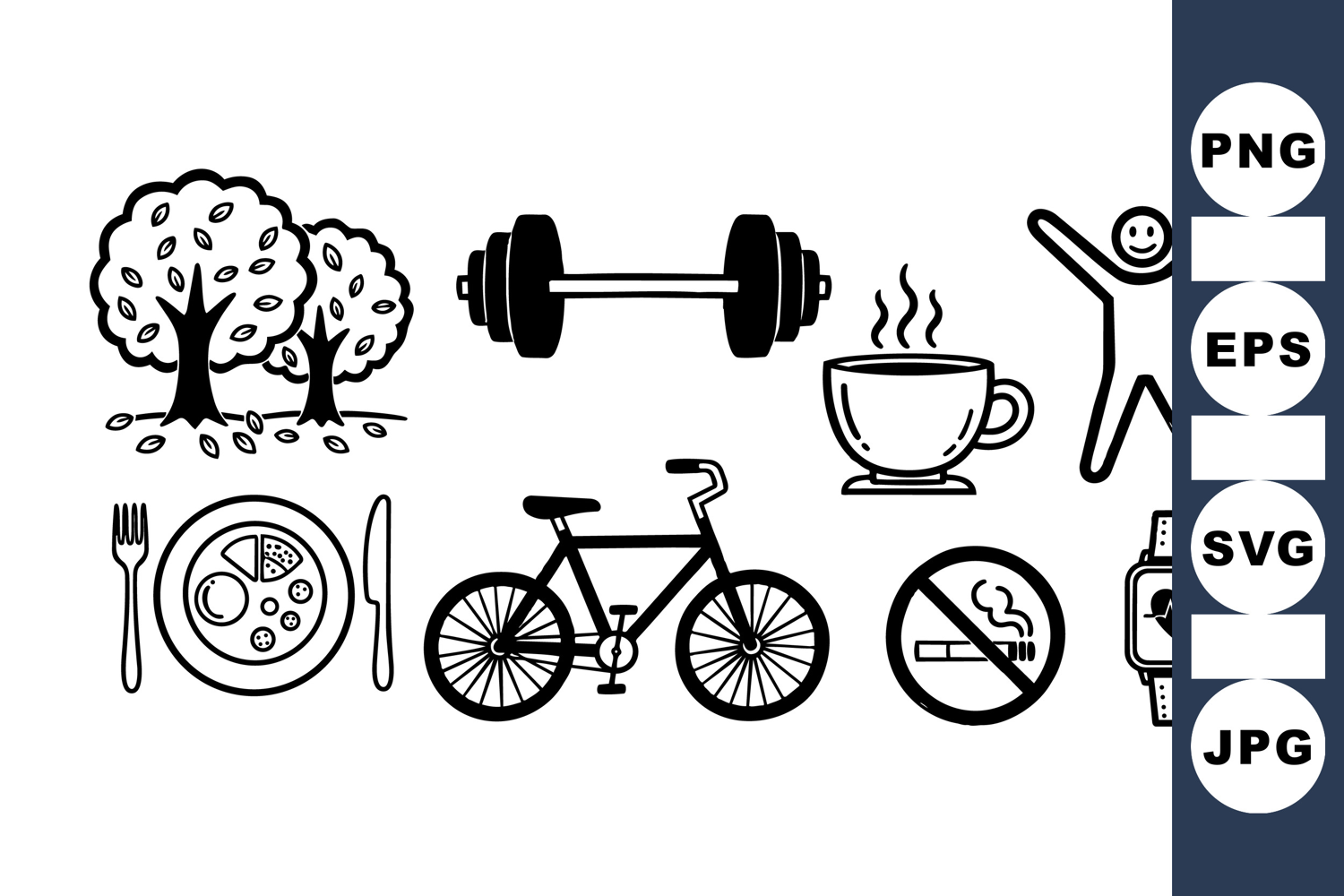 Healthy Lifestyle Icons Fitness Tracker Icons Wellness Symbol Set Nutrition And Diet No Smoking Graphics Fitness Activity Graphics Exercise Clipart Pack Outdoor Activity Designs Morning Routine Icons Heart Health Bundle